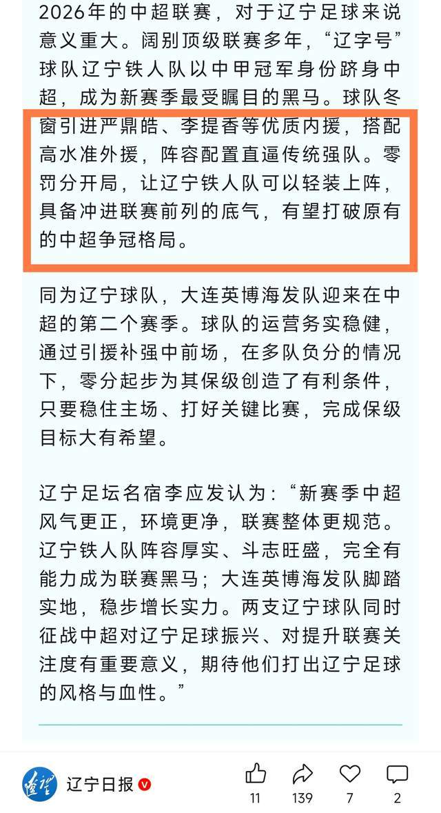 第二个,这篇文章还提到了一个细节,那就是介绍今年中超的争冠格局是群雄逐鹿,专门提到了5支球队名字,分别是海港、泰山、国安、成都蓉城和辽宁铁人,再次认可了辽宁铁人的争冠可能性。